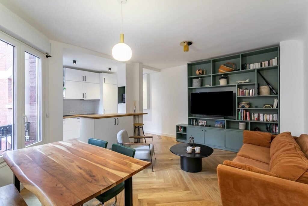 En este proyecto se ha modificado completamente la distribución original del piso, creando nuevas áreas abiertas entre el salón estudio, el comedor y la cocina.