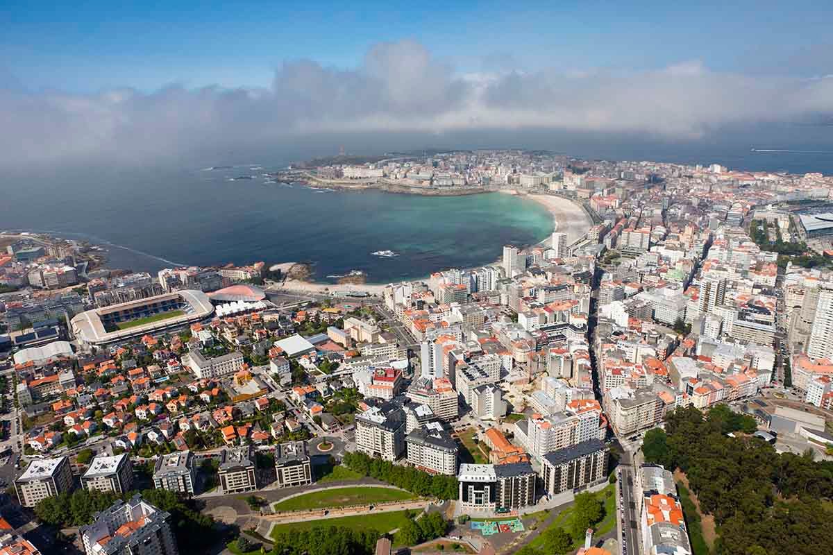 Aerial view of A Coruña with the beaches of Riazor and Orzán.